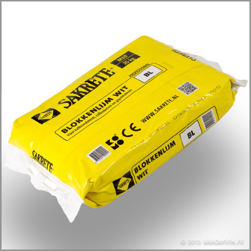 Sakrete Blokkenlijm is een kant en klare droge mortel op basis van witte portland cement conform NEN-EN 998-2 en BRL 1905. Deze blokkenlijm is geschikt als kalkzandsteenlijm en cellenbetonlijm voor binnen en buiten. Deze mortel is tevens geschikt voor het verlijmen van keramische (snelbouw)blokken als bijvoorbeeld Porotherm Poriso en voor het uitvullen, egaliseren en dunpleisteren van vlakke, gelijmde binnenwanden tot maximaal 5 mm laagdikte. Het winterrecept is geschikt voor verwerking bij lagere temperaturen (-3°C tot +15°C).